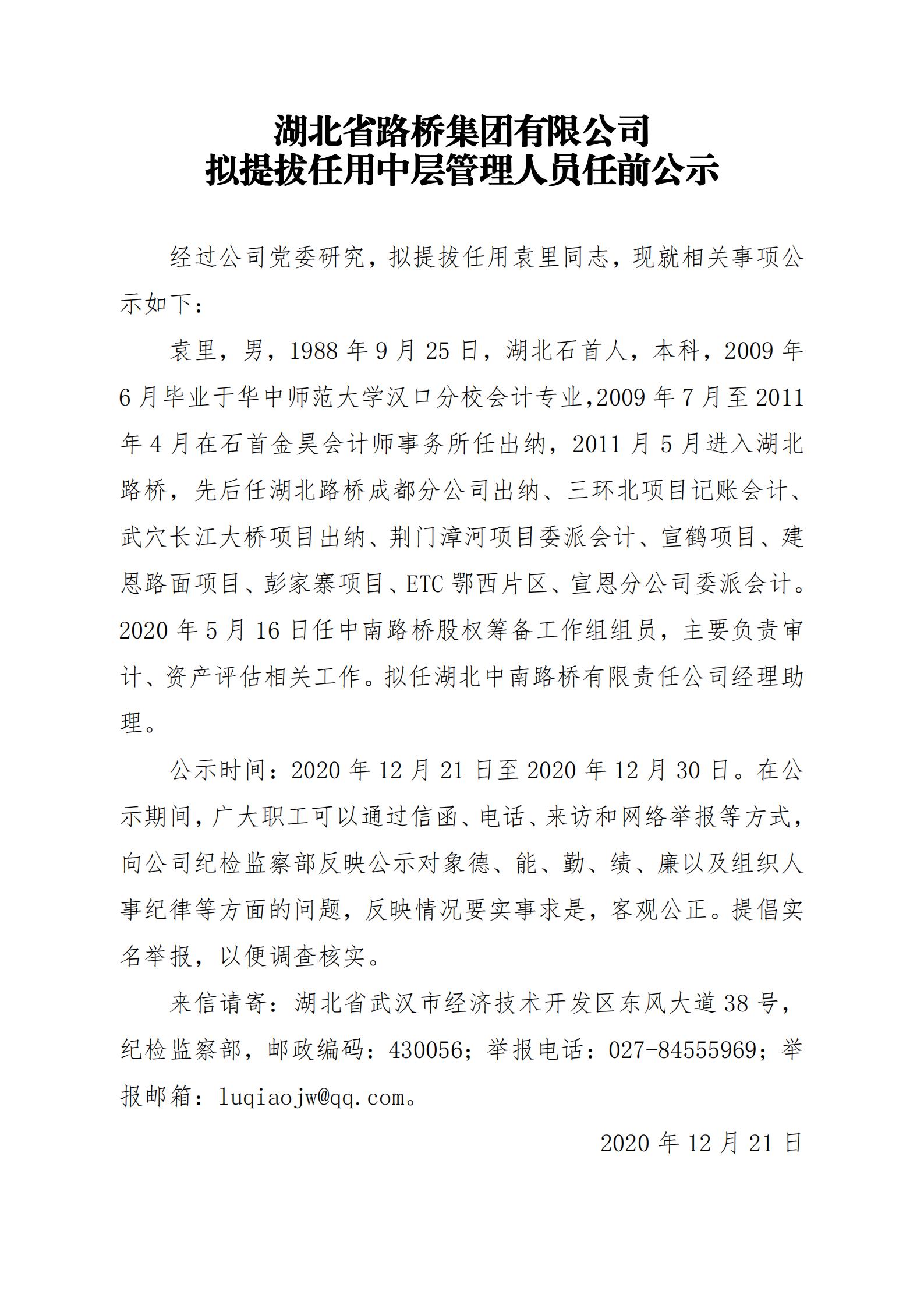 湖北省路橋集團(tuán)有限公司擬提拔任用管理人員任前公示