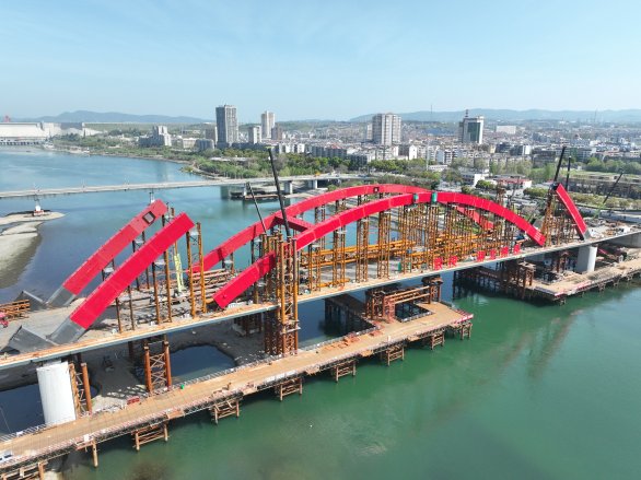 圍繞丹江口水都二橋項目,湖北路橋在本次QC成果活動中重點研制了大跨徑提籃式鋼箱系桿拱橋鋼拱肋原位拼裝支架、大斷面鋼箱梁拼裝平臺及大跨徑大斷面鋼箱梁原位拼裝支架,研發了大矢跨比超高鋼箱拱肋合龍方法、大壩泄洪區河床承臺基坑開挖方法、水位高頻變化鋼管樁施工方法、水位高頻變化大體積異形承臺施工方法、長距離大跨度大高差鋼箱梁多輪頂推方法及水位高頻變化引孔鋼板樁圍堰施工方法,重點解決了大壩泄洪區大跨度鋼箱系桿拱橋鋼管樁施工、鋼板樁圍堰施工、承臺開挖、鋼箱梁拼裝、多輪頂推、拱肋合龍等施工重難點問題。一系列關鍵核心技術的順利研發,為水都二橋項目創優創杯工作打下堅實基礎。