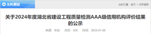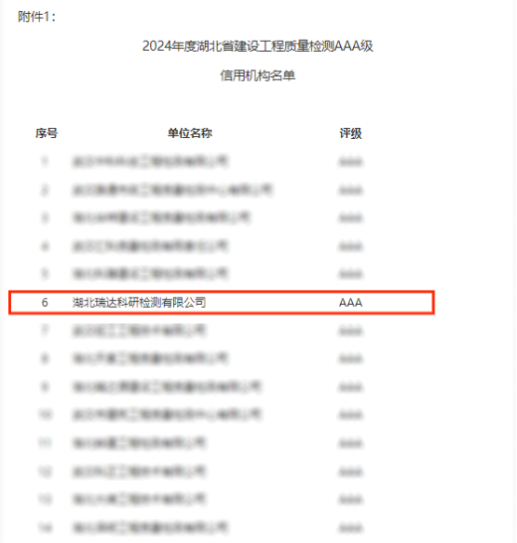 近日,湖北省建設(shè)工程質(zhì)量安全協(xié)會發(fā)布了2024年度湖北省建設(shè)工程質(zhì)量檢測AAA級信用機構(gòu)評價結(jié)果,瑞達科研檢測公司憑借優(yōu)異的誠信建設(shè)和信用管理能力,榮獲最高級“AAA級”信用機構(gòu)評價。