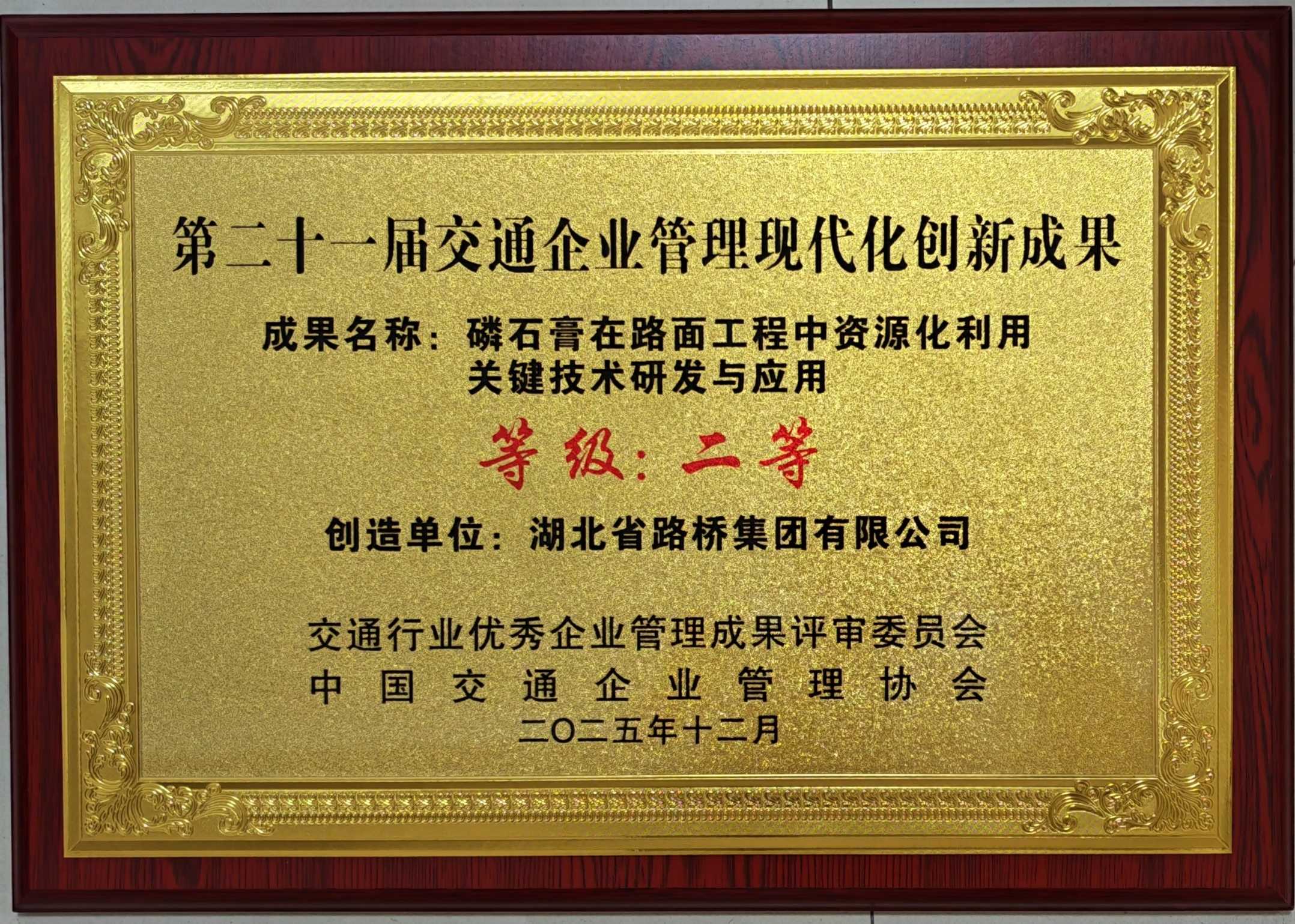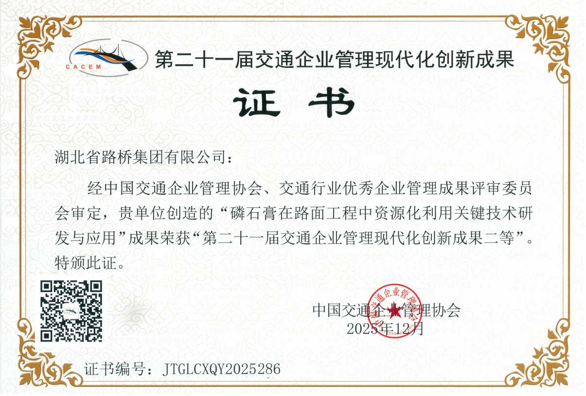近日,由中國交通企業(yè)管理協(xié)會主辦的第二十一屆交通企業(yè)管理創(chuàng)新成果發(fā)布會在廣州順利召開,湖北路橋申報(bào)的《磷石膏在路面工程中資源化利用關(guān)鍵技術(shù)研發(fā)與應(yīng)用》憑借突出的技術(shù)創(chuàng)新性、顯著的環(huán)保效益與廣闊的推廣應(yīng)用前景,在眾多參評成果中脫穎而出,成功斬獲“第二十一屆交通企業(yè)管理現(xiàn)代化創(chuàng)新成果”二等獎(jiǎng)。這一榮譽(yù)不僅是對湖北路橋在工業(yè)固廢資源化利用領(lǐng)域技術(shù)實(shí)力的高度認(rèn)可,也標(biāo)志著我國在工業(yè)固廢大規(guī)模資源化應(yīng)用于交通基礎(chǔ)設(shè)施建設(shè)方面取得了又一重要突破。