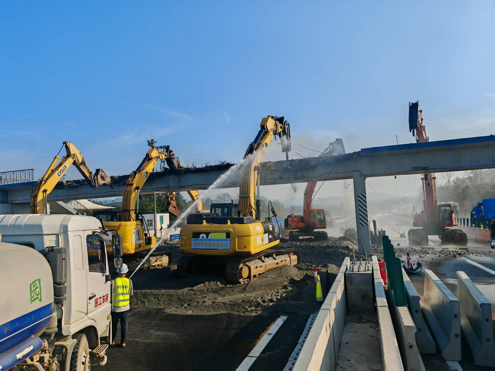 施工環(huán)節(jié)中,團隊結(jié)合原橋結(jié)構(gòu)、地理位置及豐富的現(xiàn)場經(jīng)驗,采用機械破碎為主的拆除方案,遵循“先上后下、先中間后兩邊”的原則有序推進拆除進程。針對不同結(jié)構(gòu)部位靈活運用破碎錘破除、挖掘機拆除和切割吊裝工藝,將梁體轉(zhuǎn)移至地面破碎后,即時清運至線外指定場地。此次應(yīng)急搶險工程從封閉施工到恢復(fù)通行僅用12小時,以“零事故、零擁堵”的成績兌現(xiàn)了“保安全、保暢通”的攻堅承諾。