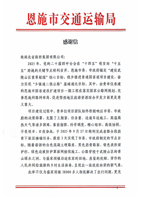 這封感謝信,不僅是對(duì)湖北路橋的認(rèn)可,更是向每一位為打通武陵山區(qū)“咽喉要道”而奮戰(zhàn)的建設(shè)者辛苦攻堅(jiān)的肯定。短短兩頁紙,承載著盛家壩鎮(zhèn)3.8萬群眾“出門走上瀝青路”的多年夢(mèng)想,也為湖北路橋在鄂西版圖再添一枚“榮譽(yù)勛章”。這既是對(duì)項(xiàng)目管理水平、施工實(shí)力與企業(yè)品牌的有力印證,也體現(xiàn)了政企同心、協(xié)力攻堅(jiān)的深厚情誼。