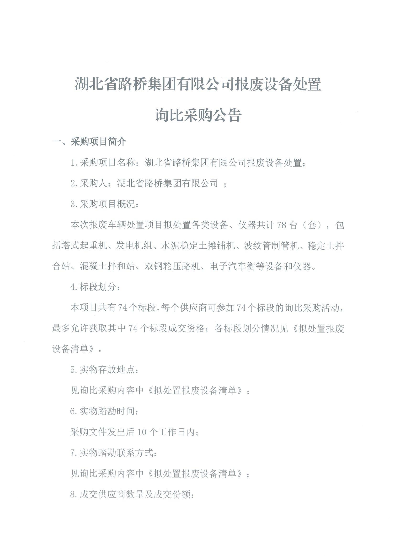 湖北省路橋集團有限公司報廢設備處置詢比采購公告